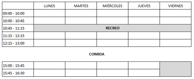 Durante los meses de septiembre y junio no hay clases por las tardes, siendo el horario de todos los días de 9:00 a 13:00 Horas.