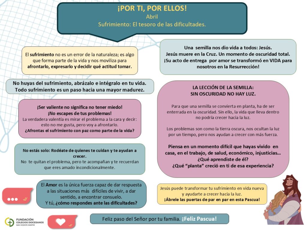 Os invitamos a leer y compartir en familia la infografía del mes de abril, donde abordamos un tema profundo en nuestro proyecto “¡POR TI, POR ELLOS!”: “Sufrimiento: El tesoro de las dificultades”.