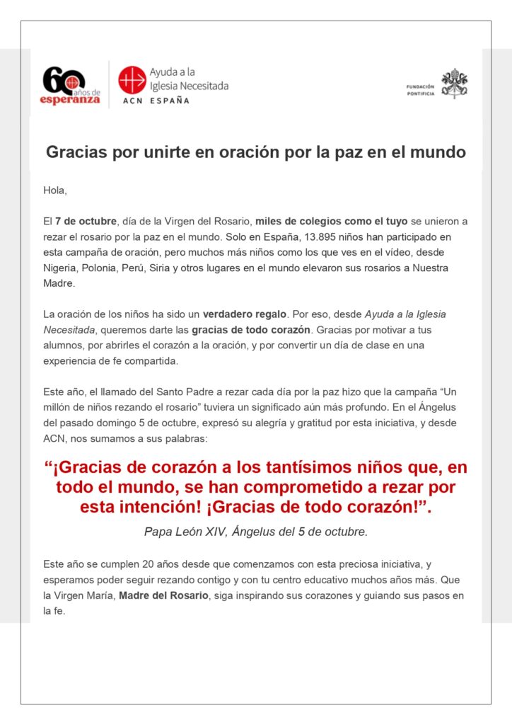 Solo en España, 13.895 niños participaron en esta iniciativa. Nos sumamos a la alegría del Santo Padre por la oración de nuestros alumnos: «¡Gracias de todo corazón!».